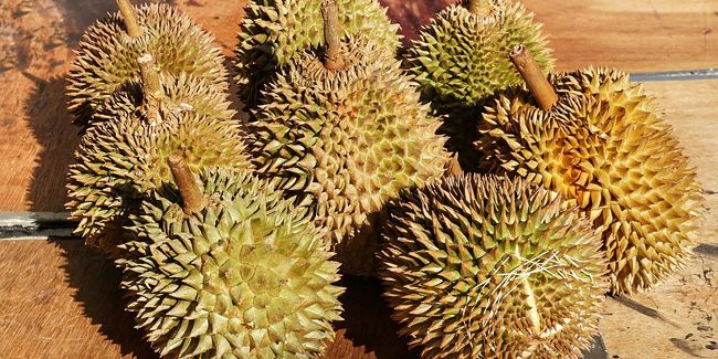 Les fruits qui suivent cette floraison sont revêtus d'une carapace épineuse impressionnante et peuvent mesurer jusqu'à 30 cm et peser plusieurs kilogrammes. Leur odeur forte se décrit comme un mélange de fromage, d'oignon et de plusieurs autres senteurs telles que le caramel et la vanille. En raison de cette odeur caractéristique, les durians sont souvent soumis à des restrictions dans les lieux publics et les transports. La chair est d'une texture crémeuse et dense, et les graines qu'elle renferme sont également comestibles.