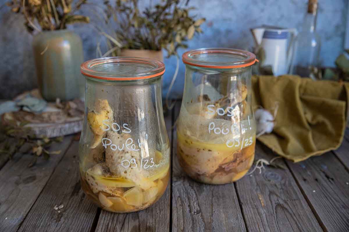 - Cuisses de poulet : 3 à 4 cuisses par bocal de 1,5 L