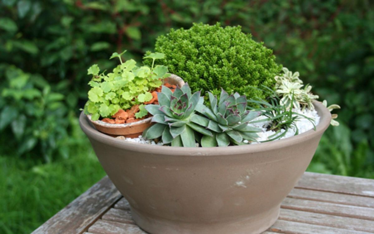 2. Installation des plantes: Remplissez le tiers de la coupe avec du terreau spécial rocaille ou un mélange à parts égales de terre de jardin et de sable. Placez la plante maîtresse, l’hébé naine, contre le bord de la coupe et callez-la avec du terreau.